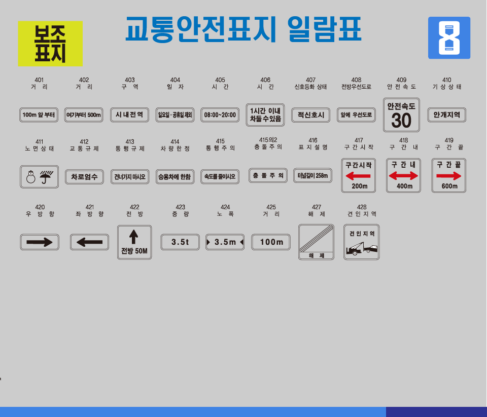 보조표지와 노면표지는 주의, 규제, 지시 표지를 보충 설명하는 표지이다. 이중에서 어린이가 꼭 알아두어야 하는 표지 5가지를 알아보겠습니다.